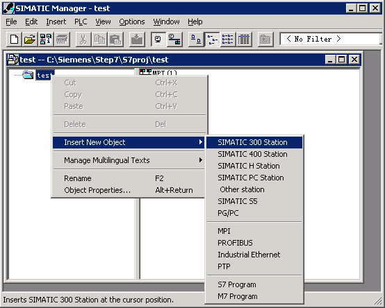 3、点亮TEST项目名称,点击右键,选中Insert new object,点击SIMATIC 300 STATION