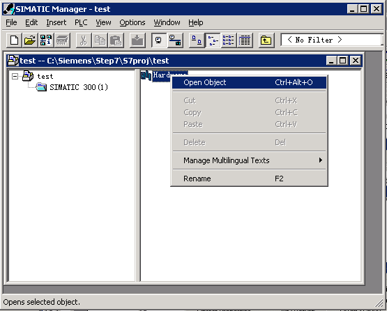 4、 TEST左面的+点开,选中SIMATIC 300(1),然后选中Hardware并双击/或右键点OPEN OBJECT,硬件组态画面即可打开!