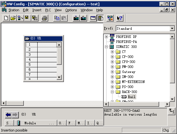 5、双击SIMATIC 300\RACK-300,然后将Rail 拖入到左边空白处。生成空机架。