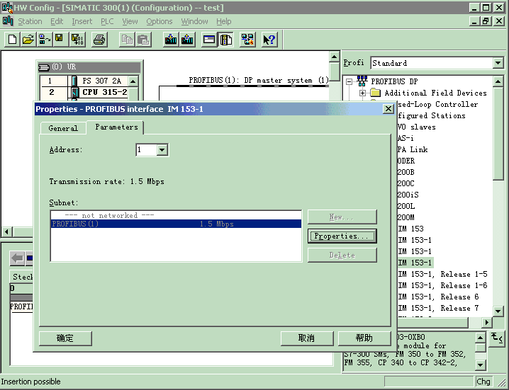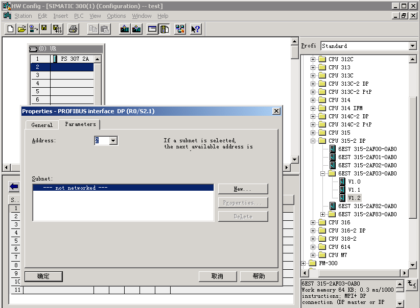 7、双击CPU-300,双击CPU-315-2DP,双击6ES7 315-2AF03-0AB0,选中V1.2,将其拖到机架RACK的第2个SLOT;一个组态PROFIBUS-DP的窗口将弹出,在Address 中选择分配你的DP地址,默认为2;