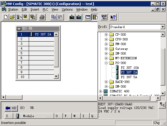 6、双击PS-300,选中PS 307 2A,将其拖到机架RACK的第一个SLOT;