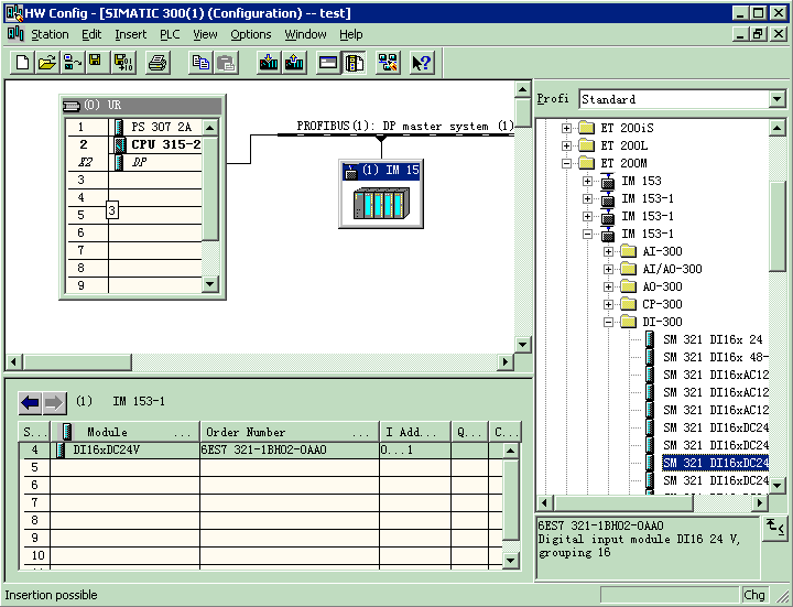 12、点开IM153-1\再点开DI300\选中SM321 DI16*DC24V模块,并将其拖入左下面的第4 槽中,一个DI模块组态完毕,系统将自动为模块的通道分配I/O地址(该处为I0.0~I1.7)。