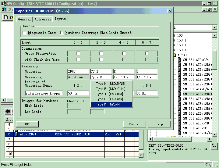 14、按照上面的方法组态AI模拟量模块(6ES7 331 7KF01-0AB0);然后双击该模块,弹出模块属性画面,点击Measuring栏,为每个通道定义信号类型,将0-1通道定义为两线制4~20mA信号,2-3通道为内部补偿K型热点偶信号(TI-C K)。